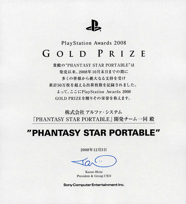 また、昨年12月に「PHANTASY STAR PORTABLE」で受賞していた、「PlayStation Awards 2008 GOLD PRIZE」の賞状が届きました。